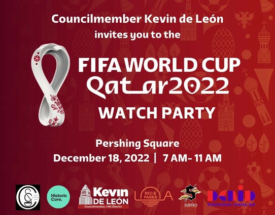 Councilmember Kevin de León invites you to the FIFA World Cup Qatar 2022 Watch Party at Pershing Square on December 18 from 7 am-11 am!