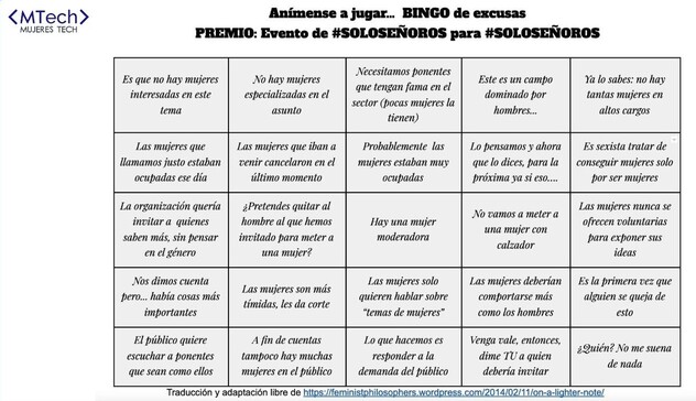 Soy cofundadora de la Asociación @MujeresTech y cuando llamamos la atención por la falta de mujeres expertas en foros y eventos del sector tecnológico nos dan #excusas absurdas. Las más de 500 personas que estamos en la red jugamos al siguiente #BingodeMachiruladas @Juliaenlaonda