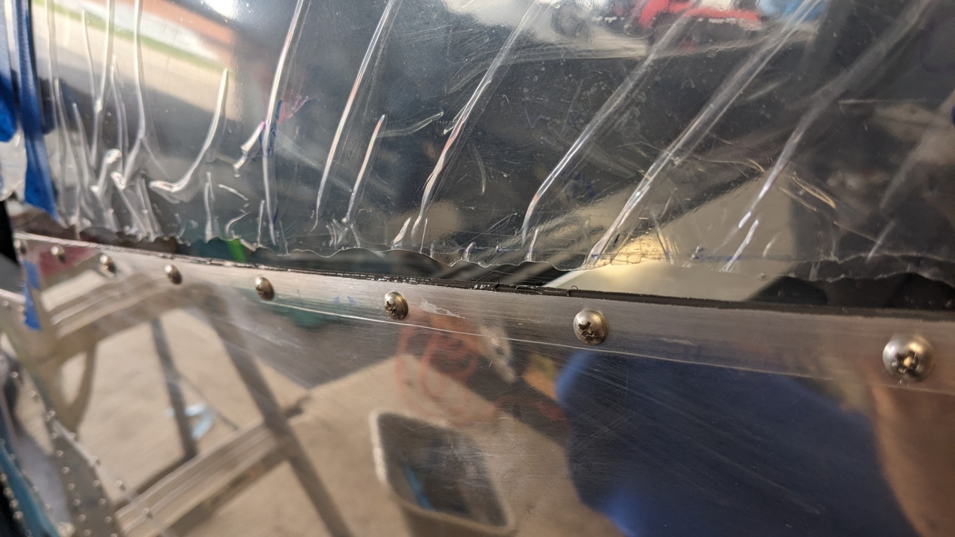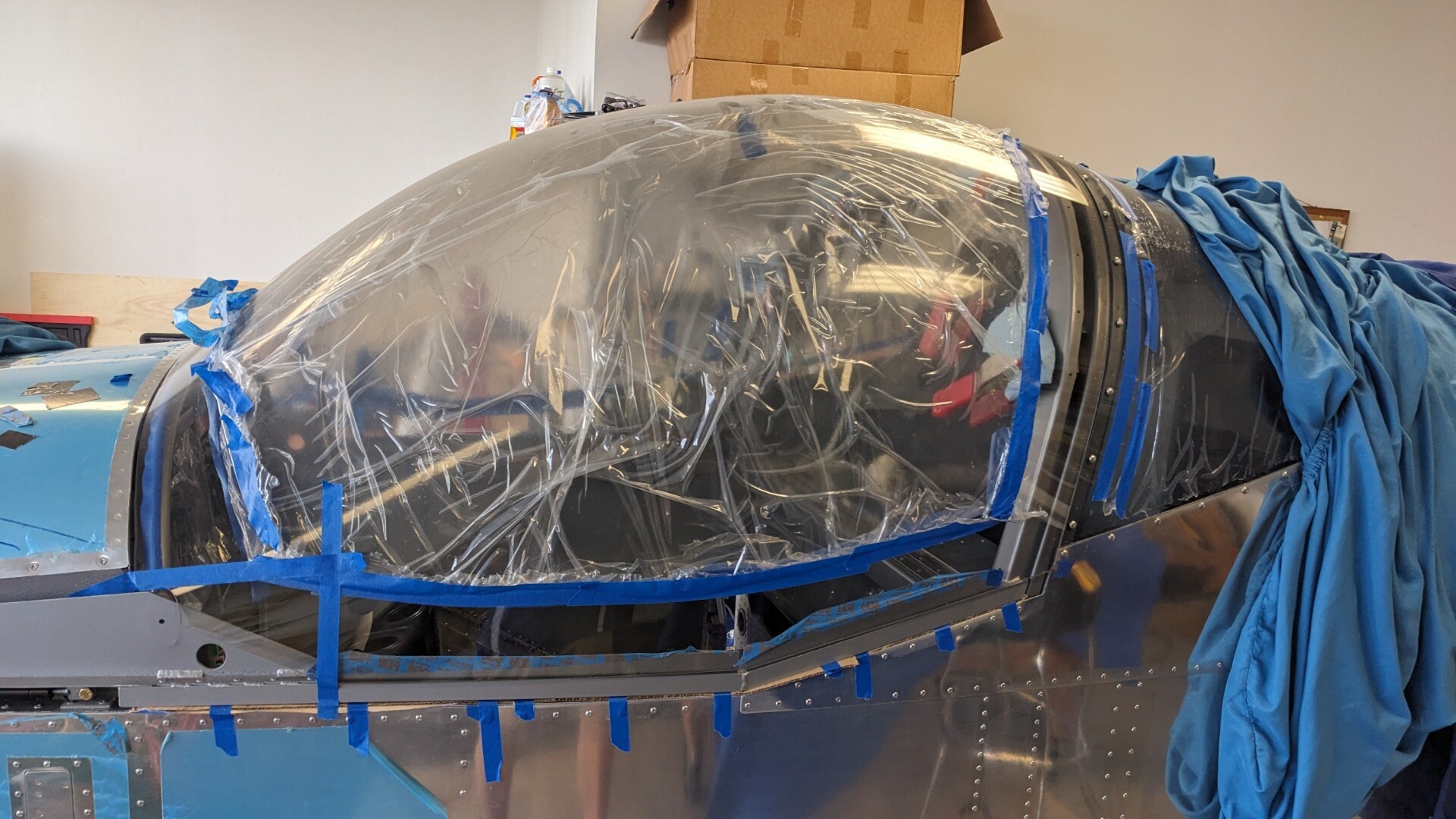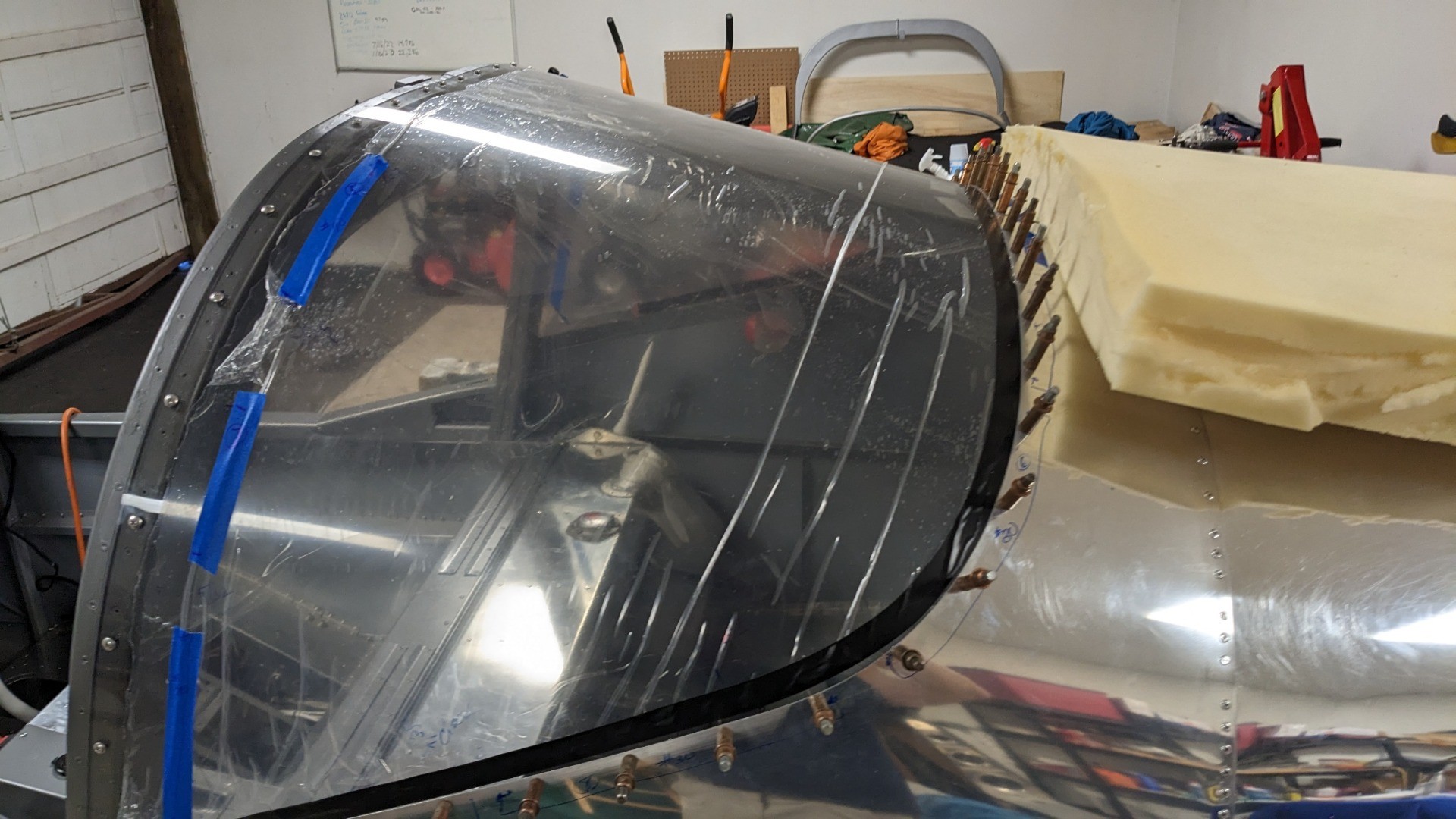 It finally hit 85 in the Twin Cities, a nice, safe temperature for drilling into acrylic plastic, which is very brittle and prone to cracking at lower temperatures. Still a little work to do on attaching the rear window to the RV-12iS project, but getting this part done allows a bunch of other work to take place.