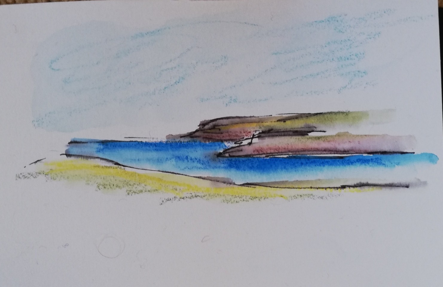 This memory of the Orcadian coast near Skara Brae was done purely to experiment with a water soluble pen and some water soluble crayons.
