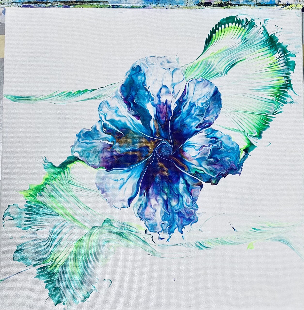 Well, I quite like how this experiment #painting turned out. It’s sort of a blue hibiscus almost. I got some really groovy effects using the chain pull from an old ceiling fan, and a 60 ml horse syringe loaded up with some layered, leveled, acrylics. I’ll be honest though, I’m not sure which direction is up, for hanging. #art #play #experimenting