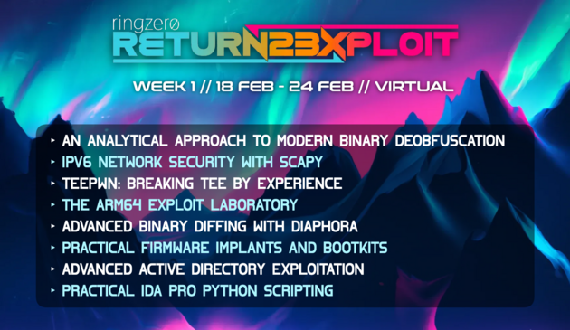 Level up your #cybersecurity skills with #RETURN23XPLOIT! Our trainings offer hands-on instruction from top industry experts. In week 1, learn #Diffing, #ExploitDev, #ARM64, #ReverseEngineering, #IDAPro & more. Don't miss out!