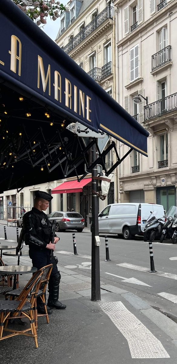 City of Blight: A machine gun-toting gendarme stands sentry in front of my favorite brasserie on the Canal Saint-Martin. Today marks the 10th in a series of national strikes and protests against #Macron’s unpopular move to raise the #retirement age from 62 to 64. #F24
