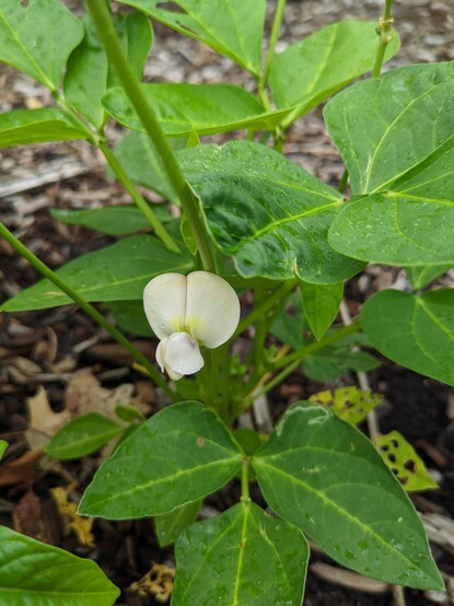 This papillonacious blacky eyed pea flower. Papillon refers to the flower resembling a butterfly. It is in the legume family, fabaceae.