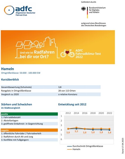 #fahrradklimatest Ergebnisse für #Hameln unter