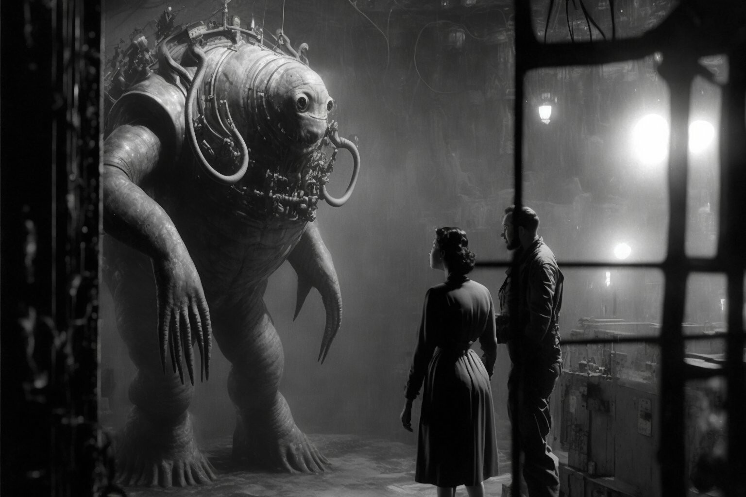 'a scene from the 1962 science fiction film Terror from the Deep, 35mm black and white'