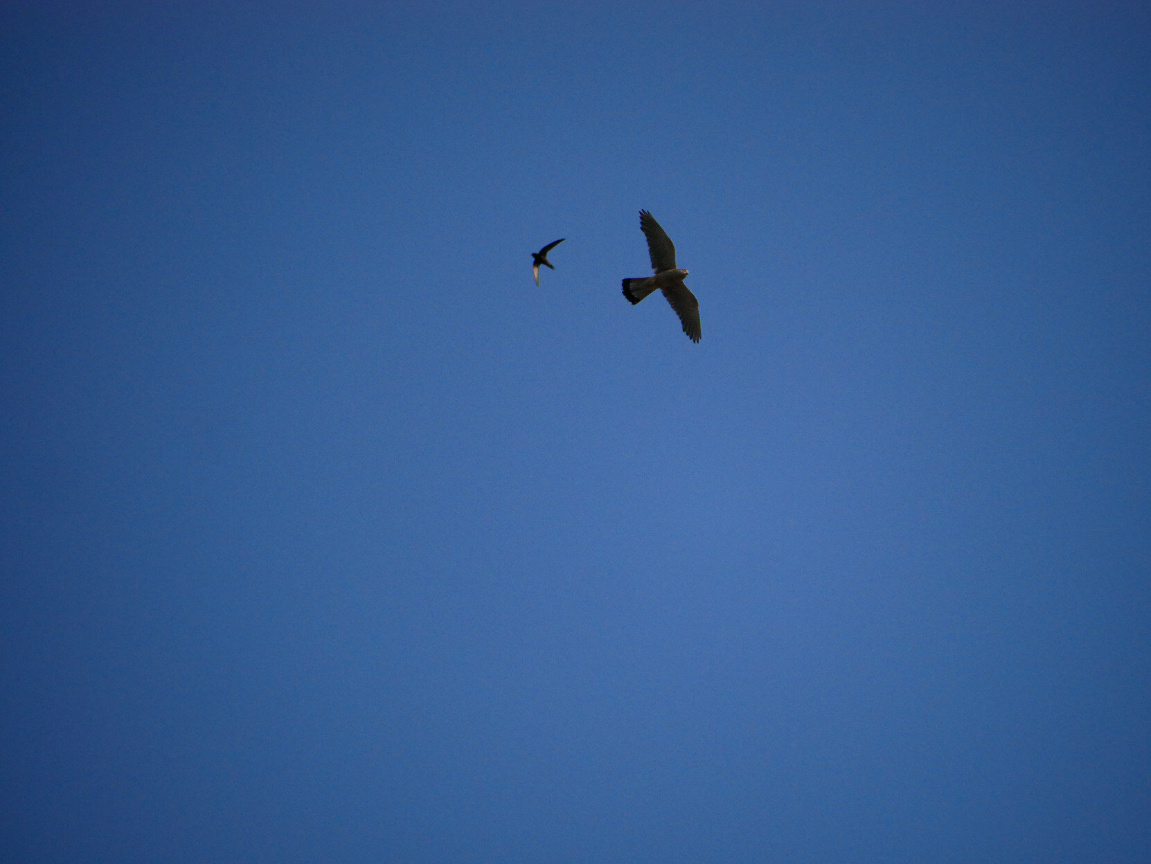 Turmfalken und Mauersegler kommen einander scheinbar nicht in die Quere, alle sind vom jeweils anderen sichtlich unbeeindruckt.