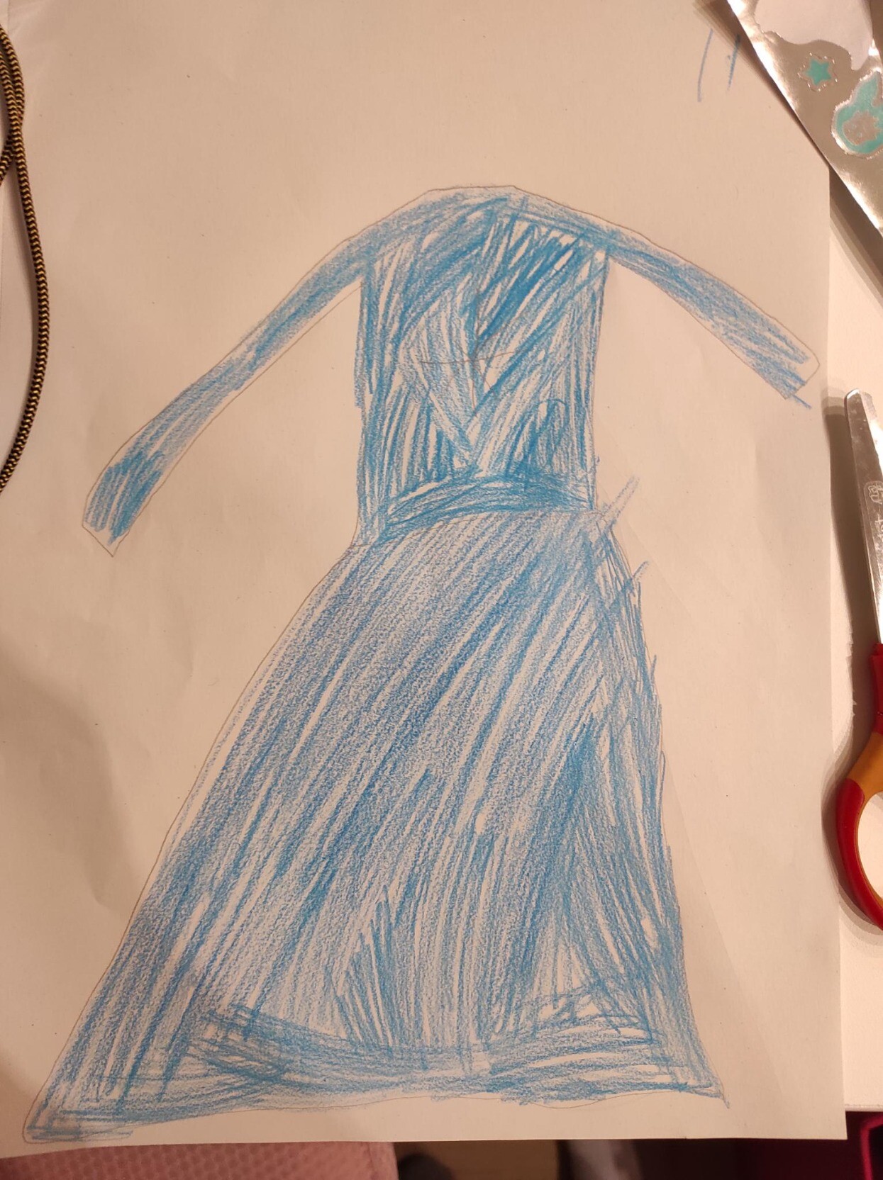 Eine Zeichnung gab es auch dazu, man beachte den Eiskristall-Plott auf der Brust. (Wir haben uns aber auf Kurzarm+Bolero geeinigt, damit es nicht zu warm wird. Sie feiert nur Indoor)