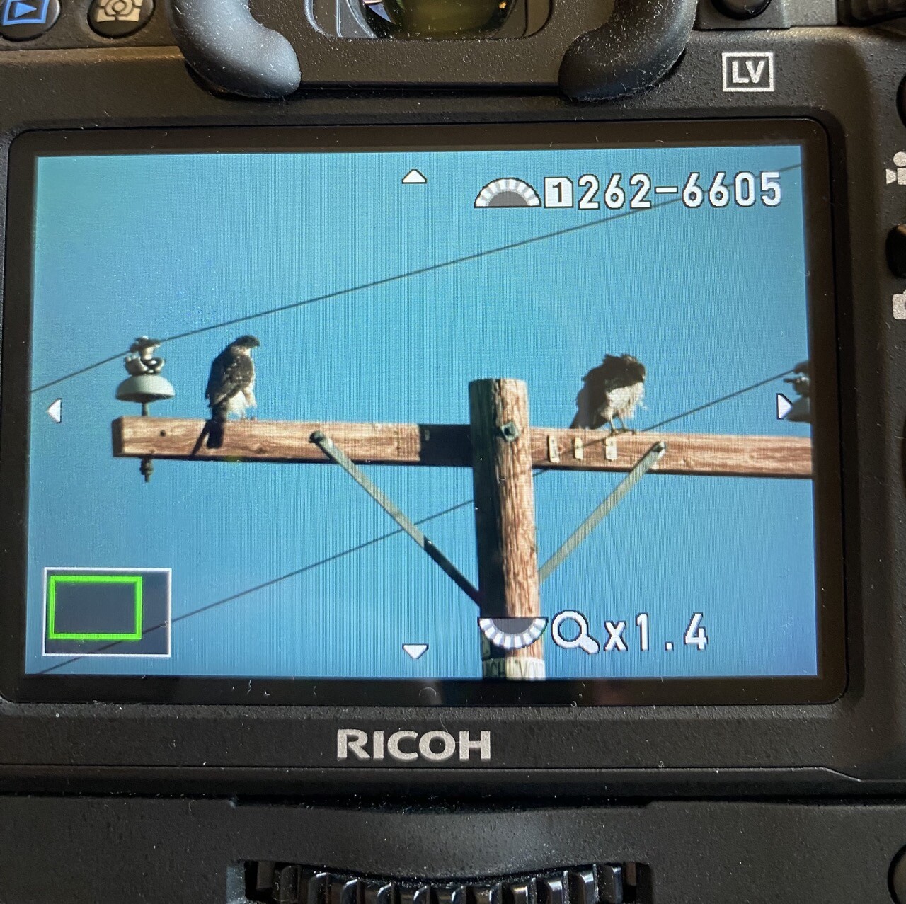 2 hawks - not sure if Cooper or Sharp-Shinned - on a telephone pole in our front yard. The ravens were NOT happy to have them there and are now escorting them out of the area!