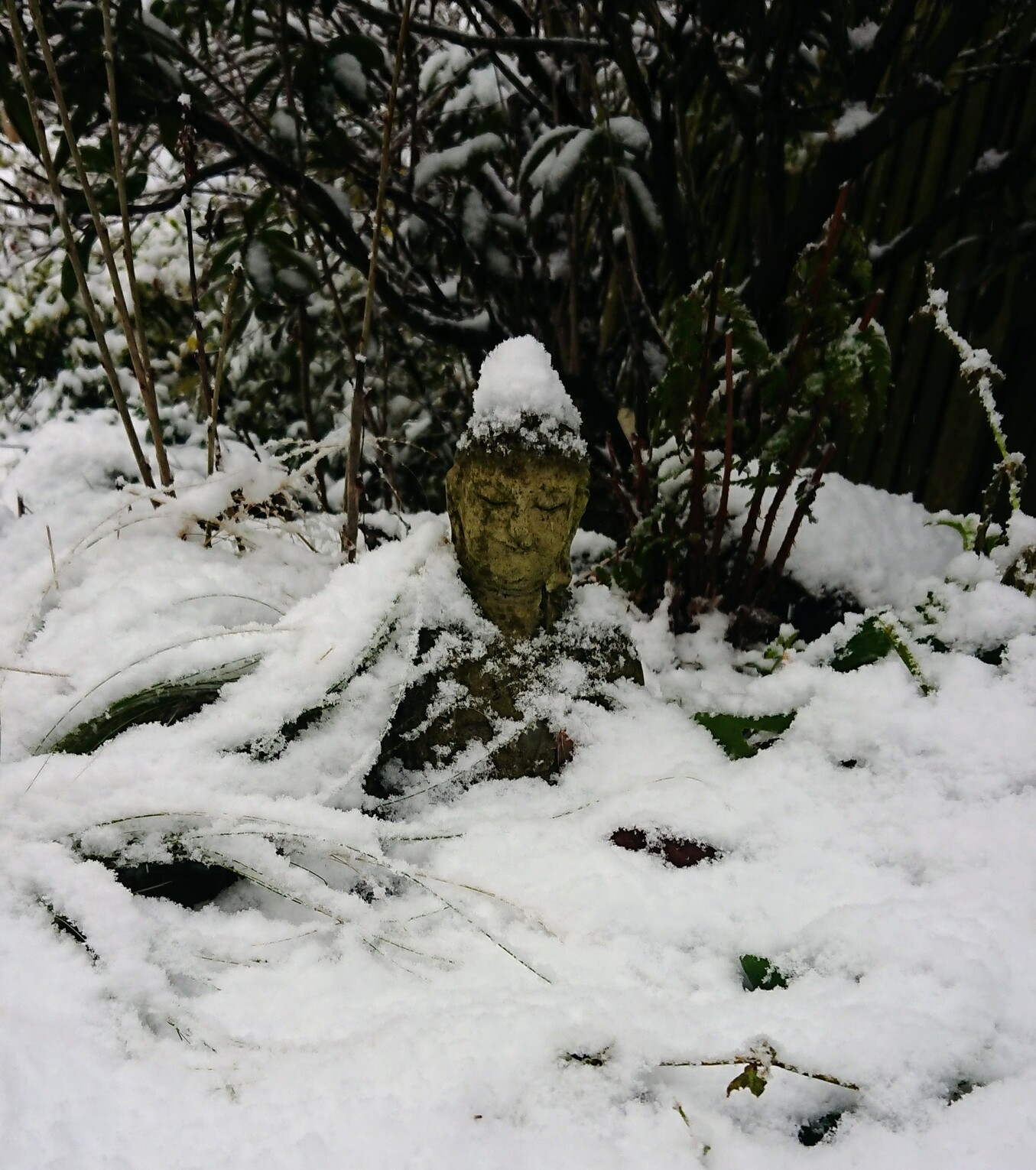 Our hare is almost buried, humum brushed the snow from his face 🌨️ and Buddha's snow hat is getting taller 🧐 and the road outside has turned into the usual hilly snowy dicey ice rink 😩. Our usual bird friends and squirrels are all okay, we're looking out for them. And.... Frank the Ferocious Fieldfare is back 🥳 so we've put out extra 🍏 for him 🍎🐦 #feedthewildlife #frankthefieldfare #lovethebirds #snow