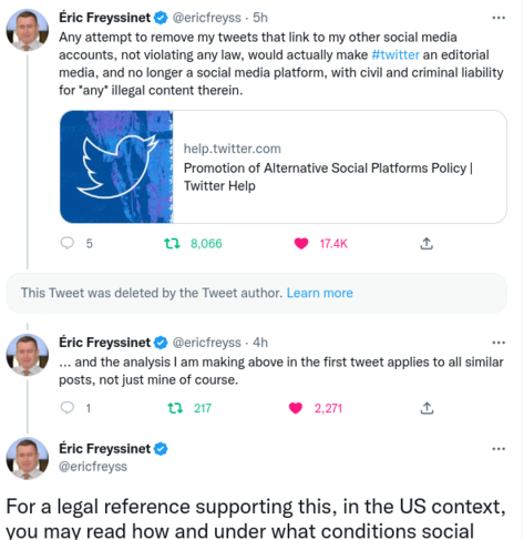 Mind you, if the point is the destruction of twitter as public square that's accessible to people around the world, then mission accomplished--and also an attack on S230 protections for social media platforms.