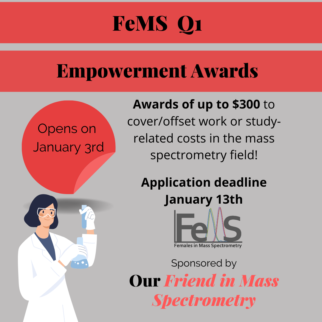 We are now accepting applications for the first round of #FeMS Empowerment Awards sponsored by our friend in mass spectrometry! Submit an application by Jan 13th for a chance to receive up to $300. Find out more and apply at: https://femalesinms.com/empowerment/