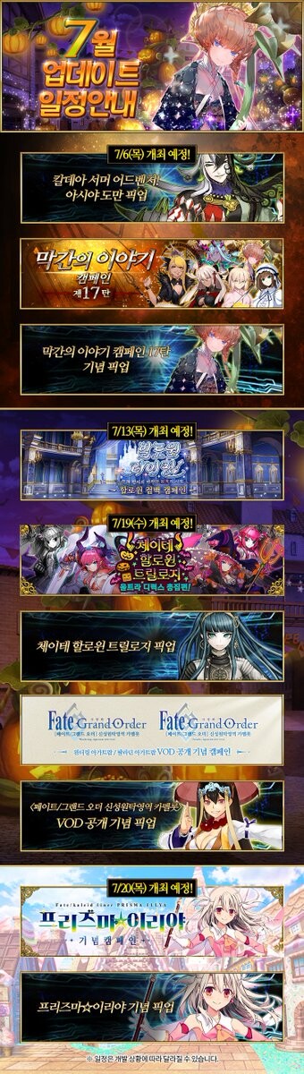 <칼데아 서머 어드벤처! 기념 아시야 도만 픽업>, <막간의 이야기 캠페인 제17탄>, <체이테 할로윈 트릴로지 울트라 디럭스 총집편!>, <신성원탁영역 카멜롯> VOD 공개 기념 캠페인, <프리즈마☆이리야 기념 캠페인>이 개최될 예정입니다!