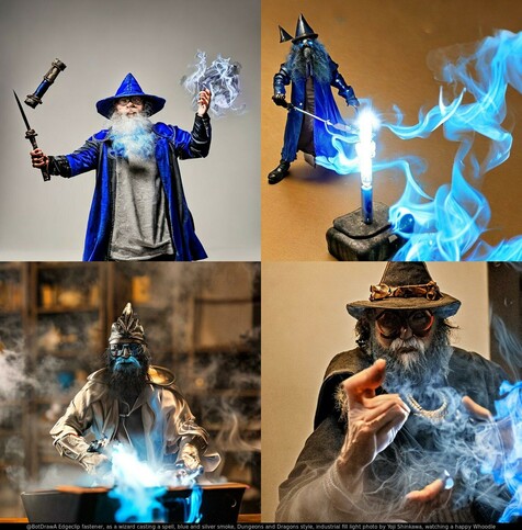 AI drawing of "Edgeclip fastener, as a wizard casting a spell, blue and silver smoke, Dungeons and Dragons style, industrial fill light photo by Yoji Shinkawa, watching a happy Whoodle"