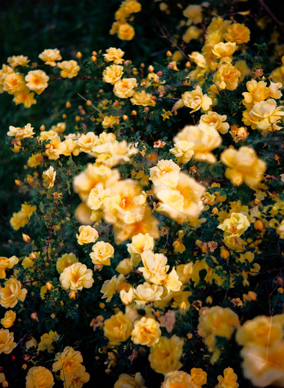 Harison’s rose, evening, June 2023. Town of Ulysses, Finger Lakes, upstate New York. Showa Optical Semi Leotax folding camera, Ektar 100, 6x4.5, serendipitous double exposure.