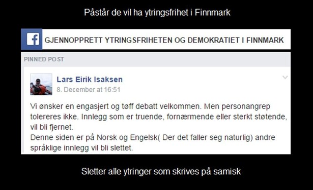 FB-gruppa "Gjennopprett (sic) ytringsfriheten og demokratiet i Finnmark" forbød innlegg på samisk. Ytringer på samisk var visst ikke omfatta av ytrinsgfriheten i #finnmark