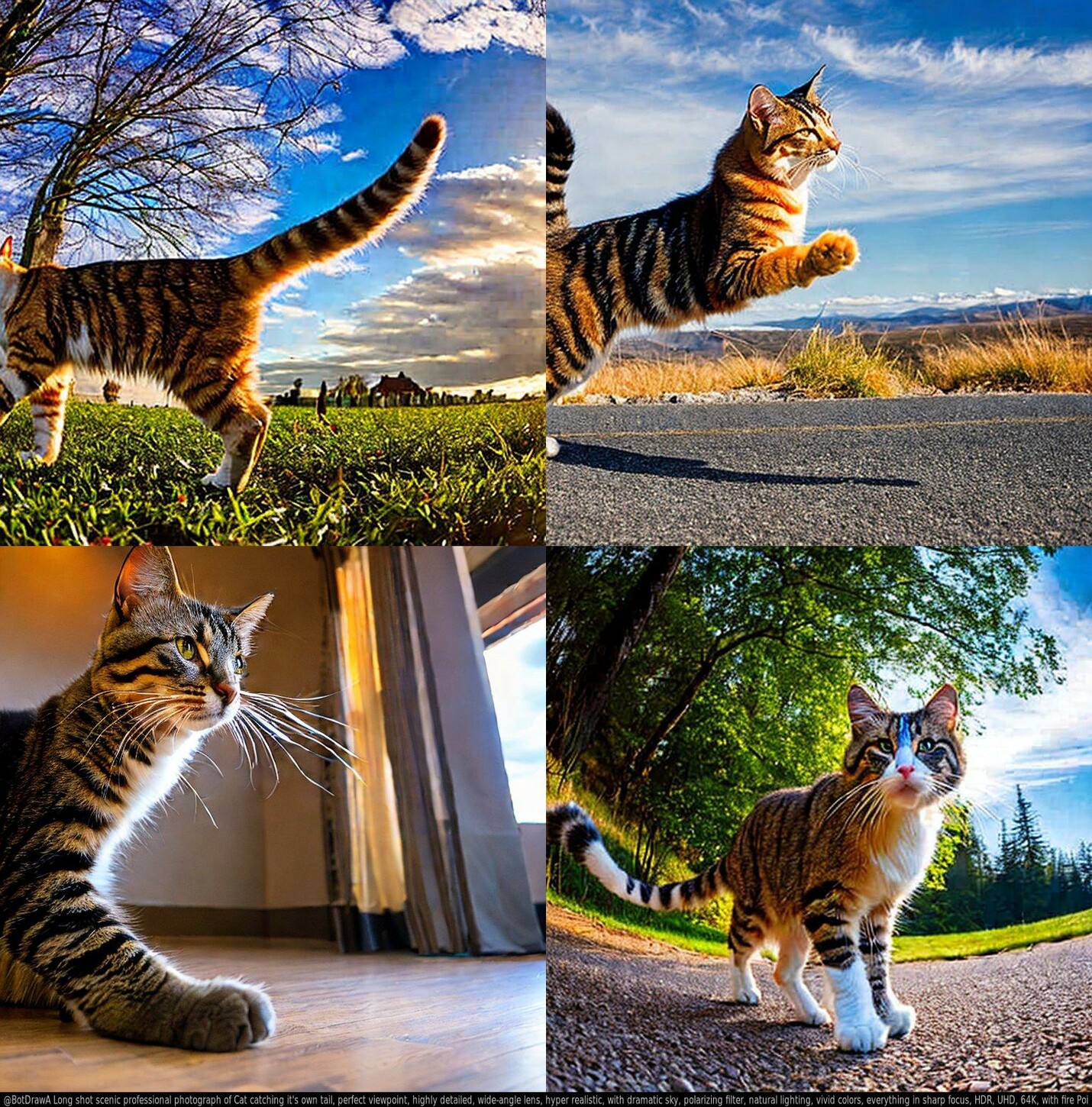 AI drawing of "Long shot scenic professional photograph of Cat catching it's own tail, perfect viewpoint, highly detailed, wide-angle lens, hyper realistic, with dramatic sky, polarizing filter, natural lighting, vivid colors, everything in sharp focus, HDR, UHD, 64K, with fire Poi"