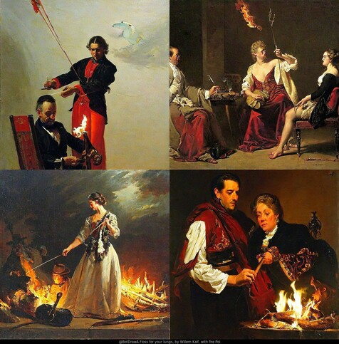 AI drawing of "Floss for your lungs, by Willem Kalf, with fire Poi"