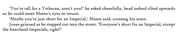 Plot development: why yes, Teo IS tall for a Ystheran and uncomfortable when strangers notice it. Could there be a reason for that?