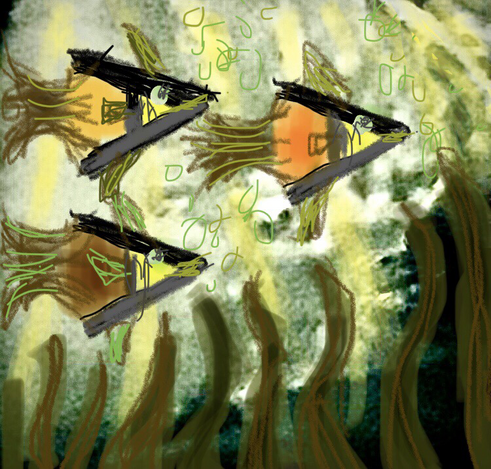These crudely-drawn fish were created using a color-modified photo of a peel-y thumbnail for the background and the iphone drawing tools in the iphone photos app. Hard to get things precise when drawing with one's fingers on an iphone screen, but I think the fish are still cute!