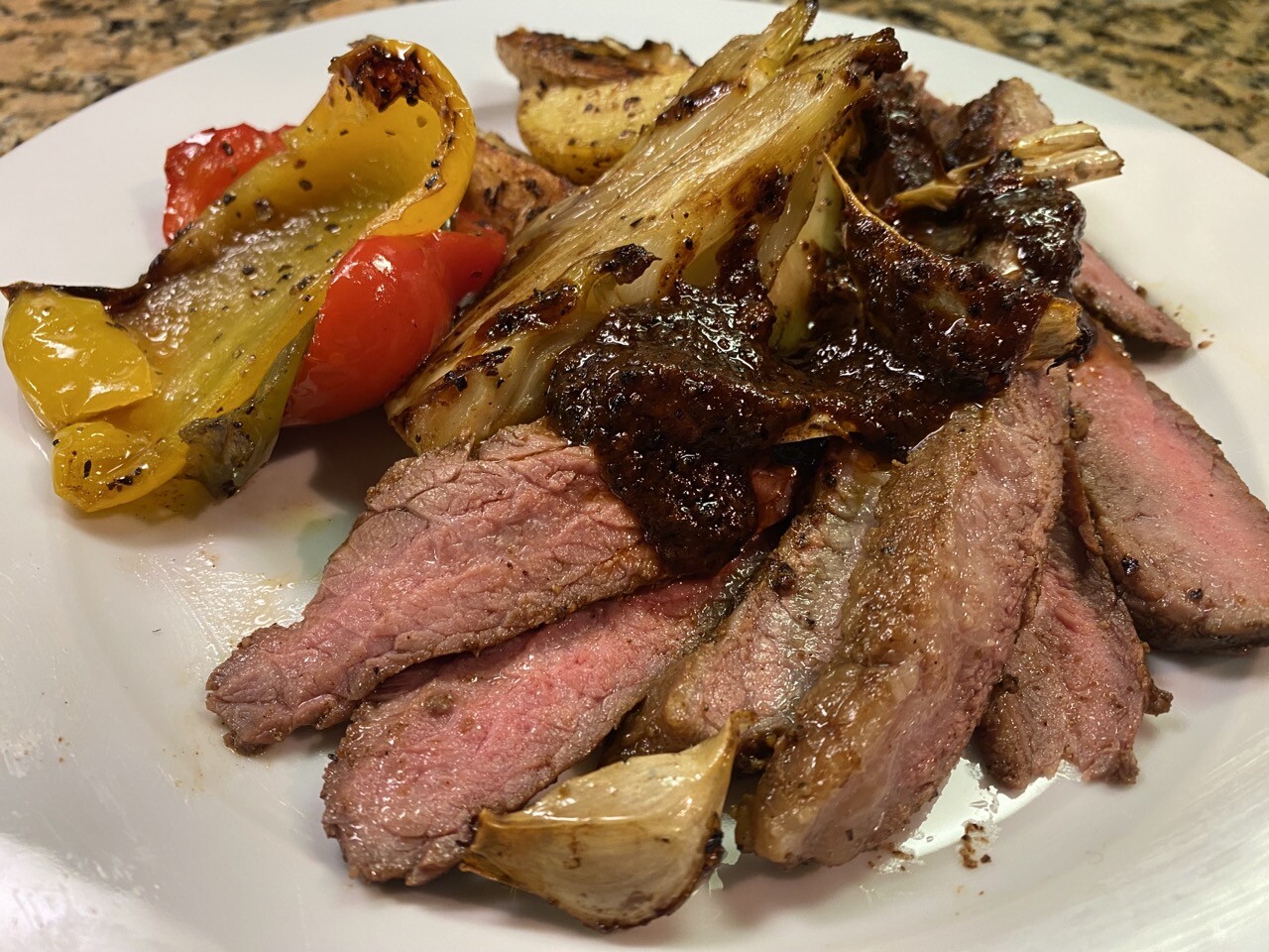 #FlankSteak rubbed with spices and pan seared, then served with roasted vegetables including yellow potatoes, tri-color sweet bell peppers, fennel, and garlic. Also deglazing from the pan. Simple but nice. #beef #food