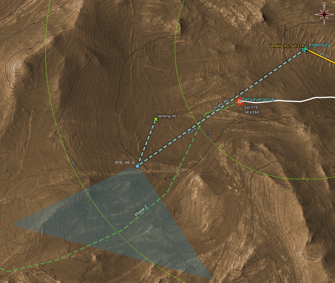 Maybe someone will have a better interpretation of the phrase "w/ max divert" which appears in #NASA's announcement for #Ingenuity's #Flight46 (https://mars.nasa.gov/technology/helicopter/status/447/flight-46-preview-by-the-numbers/), but I take it to mean a dog legged flight path (cyan dashed line) with landing between the outer reach and the takeoff location, somewhere within the triangle. This mystery plot appears in the following map, also showing assumed NLOS radio coverage for the rover.