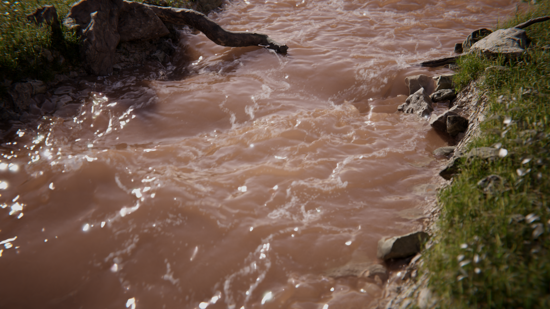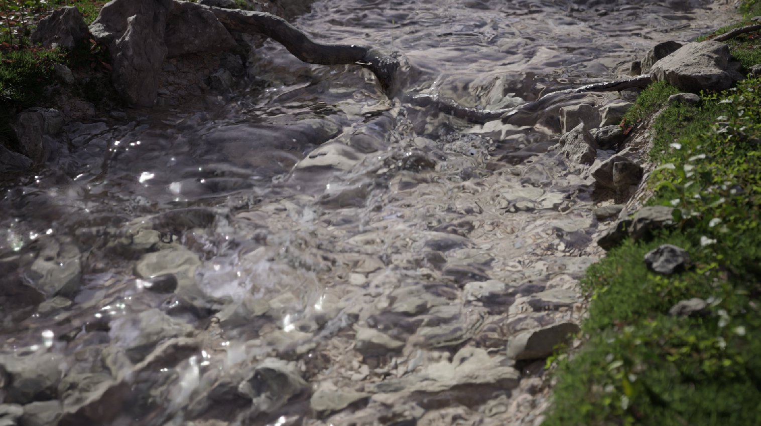 I'm still trying to complete this scene, I'm looking for better vegetation, and I'm thinking about lighting and colors. I need to add a wet map to the stones. I'm thinking of some plants caught on a branch.