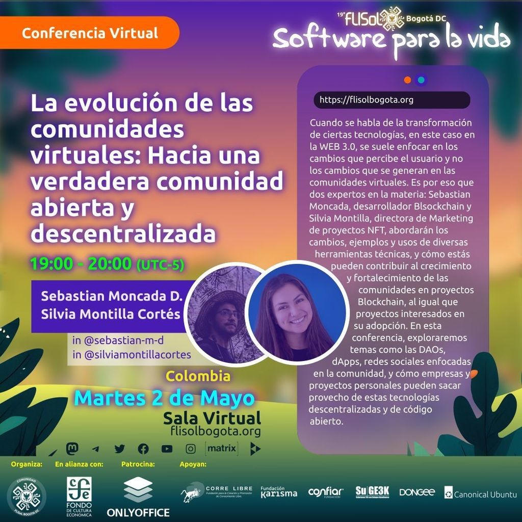 El #FLISoL2023 no se detiene. En #FLISolBog2023 hoy a las 7pm tendremos la conferencia "La evolución de las comunidades virtuales: hacia una verdadera comunidad abierta y descentralizada" con Sebastián Moncada y Silvia Mantilla en vivo por todas nuestras redes sociales.