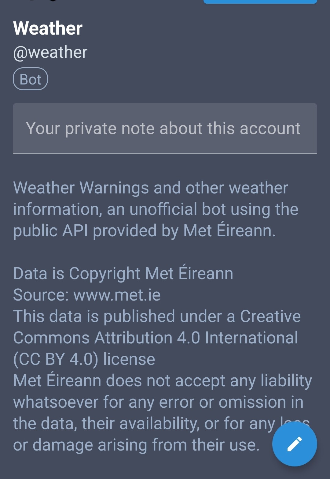 There is a WEATHER bot here if you're not keeping up with things #sneachta and #fliuch since leaving the Twitplace.