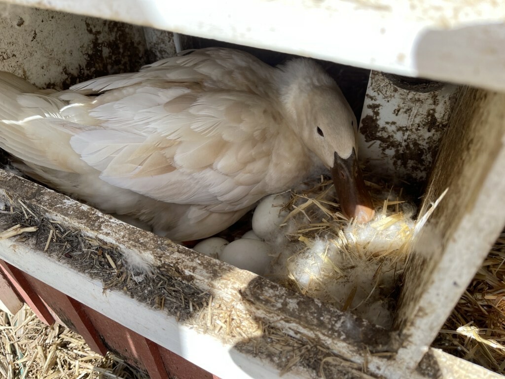 On the homestead blog: chickens, ducks, birdsโฆ and more of Betty nesting in the duck house. #FlockFriday ๐ฆ๐๐ฆ https://yellowcottagehomestead.com/2021/04/flock-friday-for-april-23/