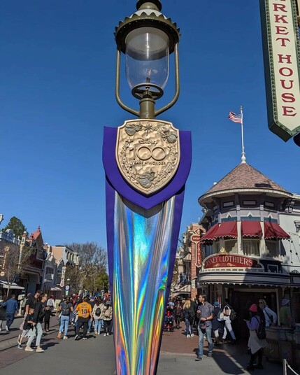Lampposts on Main Street at #disneyland with #disney100 decorations. #florafaunamerryweather #magicisback #magicishere