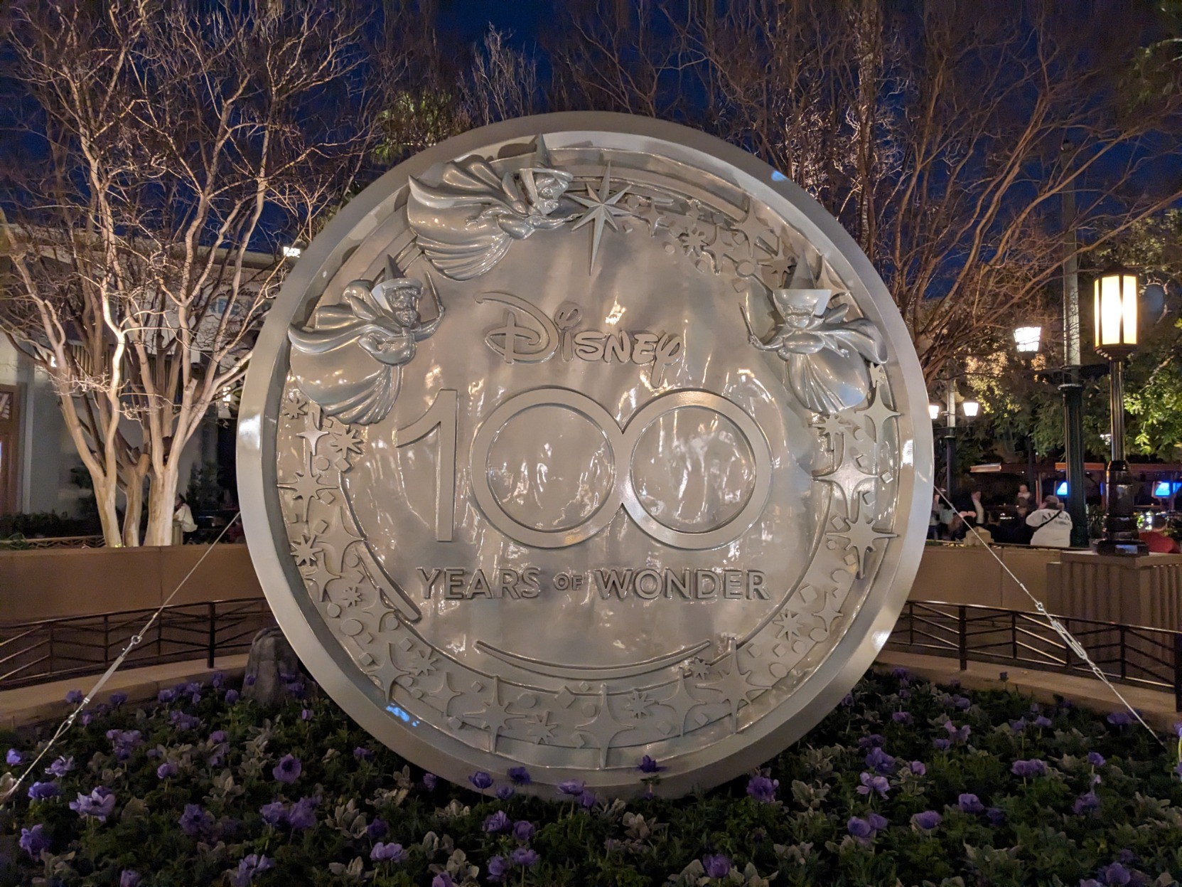 New #disney100 decor at the entrance of #disneyland . And there's #florafaunamerryweather . Makes sense given #sleepingbeautycastle . #magicisback #magicishere