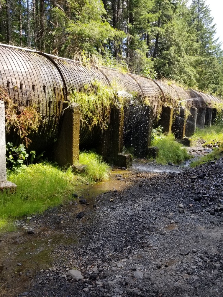 A delightful old wooden water transport pipe made like a wine barrel, spraying and misting around the shims shoved into holes and providing habitat for the little ecosystem it's created