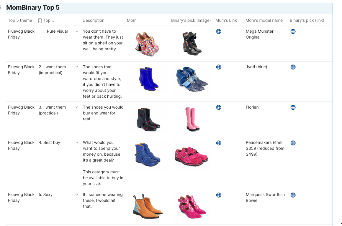 Tonight my kid suggested a fun #MomBinary activity would be to compare our fantasy #Fluevog #BlackFriday sale picks, and to do it by creating a #Coda so we could each compile our top 5 picks without seeing the other person's choices. We picked 5 #shoe categories and then went virtual shopping.