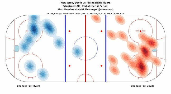 At the end of the 1st period the Devils lead the Flyers by a score of 1 to 0.