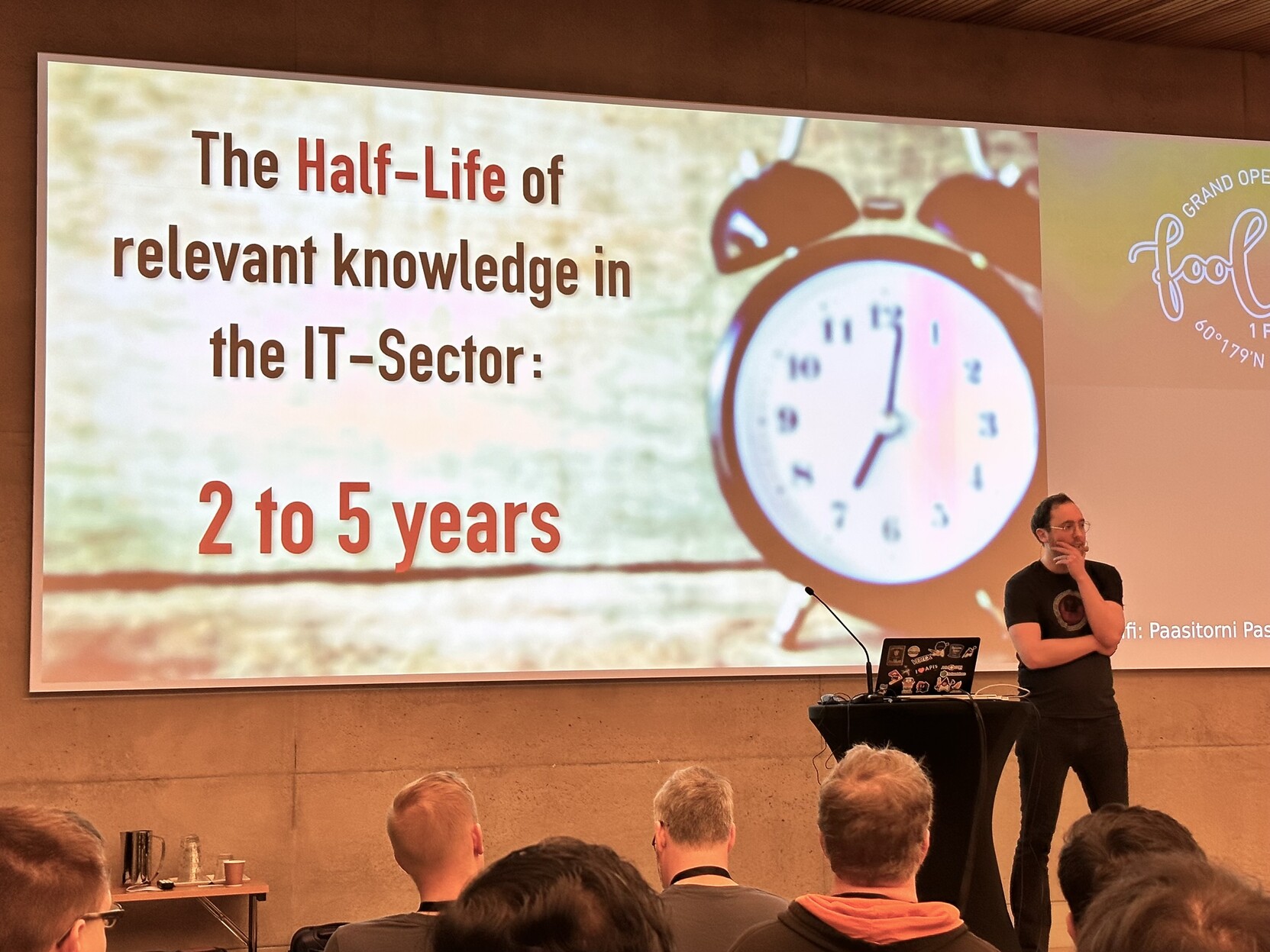 Tom Cools starts #fooconf with claim that IT knowledge half life is 2-5 years. This does feel like half life of specific tools and APIs, but yet there’s plenty of things that seem to serve us slightly better.