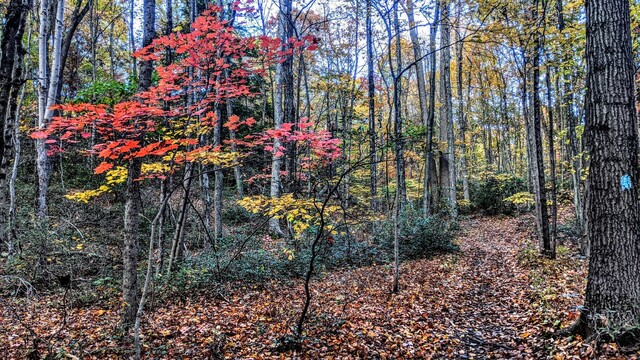 Autumn footpath, Whitestone Cliffs Trail, Plymouth, Connecticut. October 18, 2020, 5:32 PM.