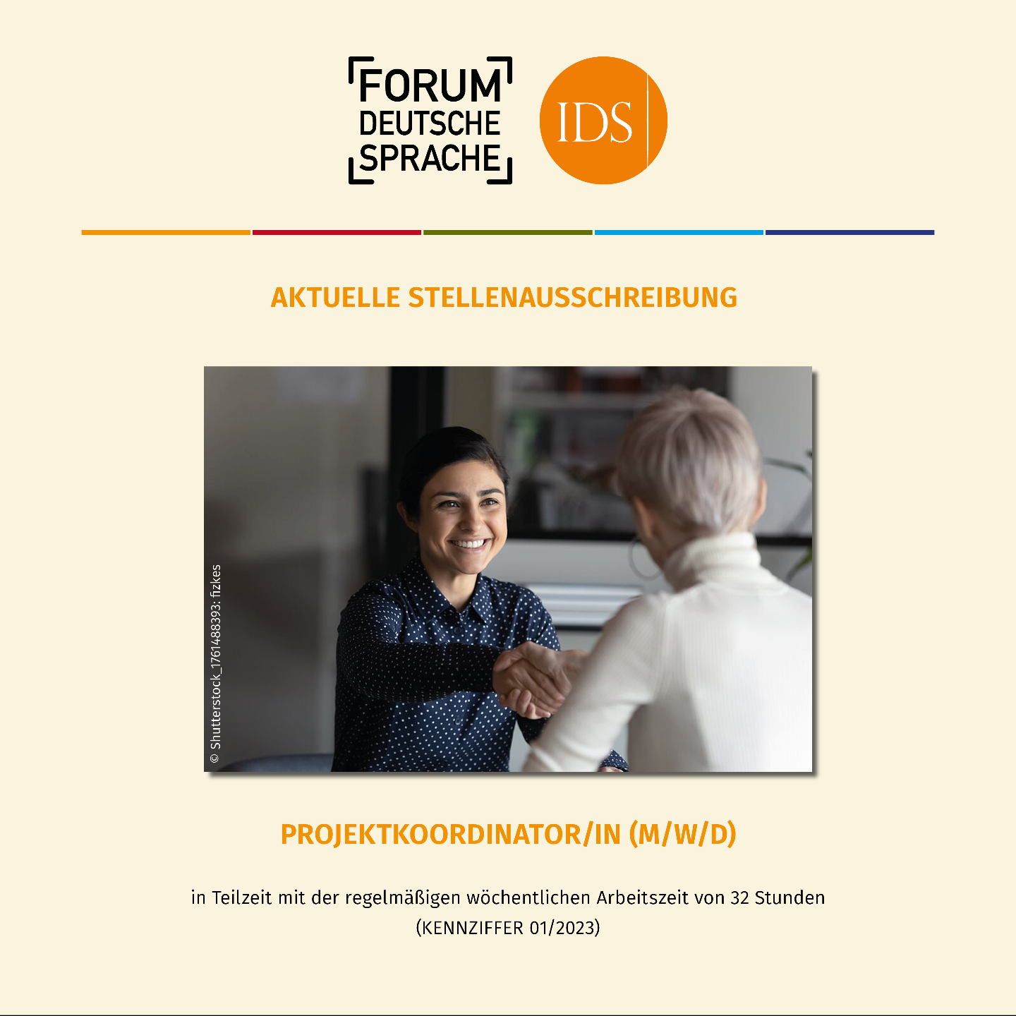 📣 Stellenausschreibung: Für das Projektteam „Forum Deutsche Sprache“ sowie den Programmbereich „Dokumentationszentrum der deutschen Sprache“ am IDS ist bis zum 10.3. die Stelle einer Projektkoordination (m/w/d) ausgeschrieben.