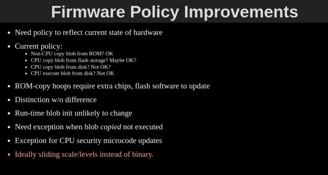 I found this @conservancy #fossy2023 talk from Kyle Rankin made a lot of very good points: "Free Software Policy With Semi-Firm Firmware"