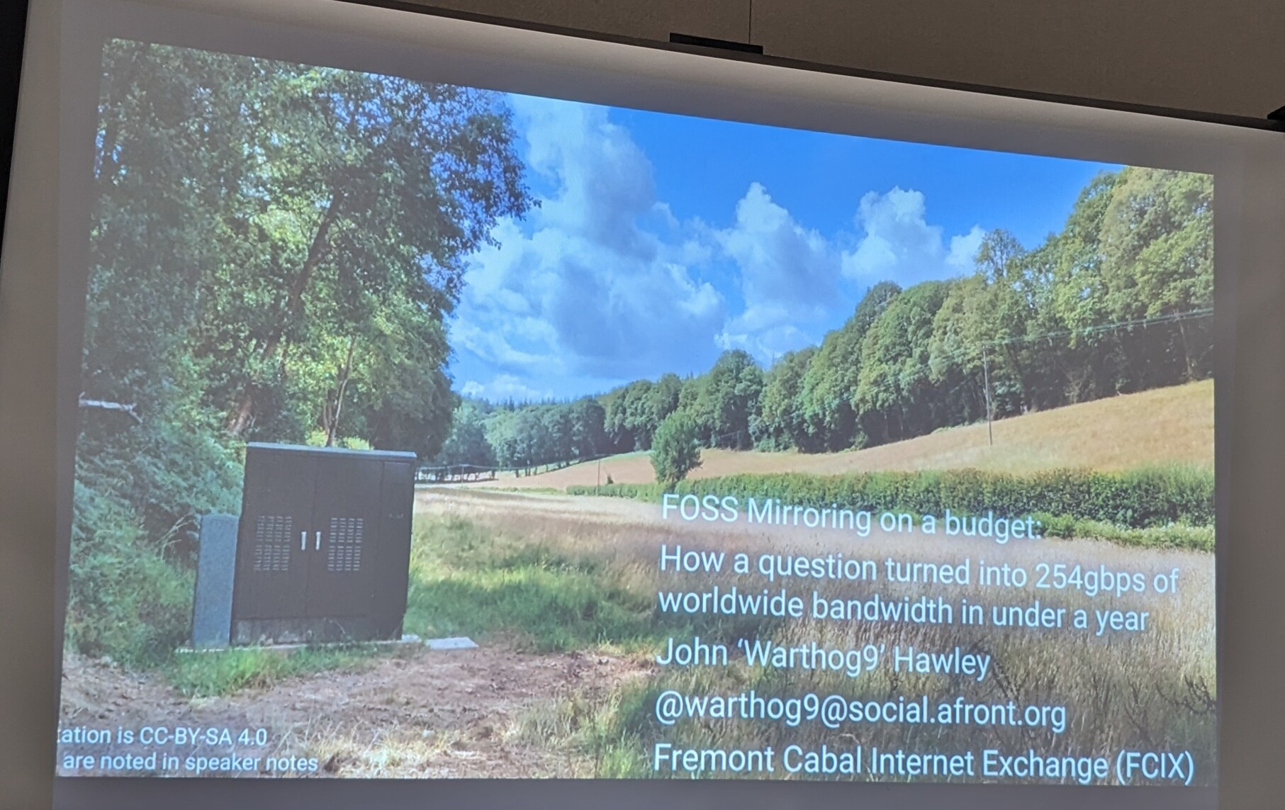 Time for @warthog9 now at @conservancy #fossy2023: "FOSS Mirroring on a budget: how a question turned into 253gbps of worldwide bandwidth in under a year" https://2023.fossy.us/schedule/presentation/77/