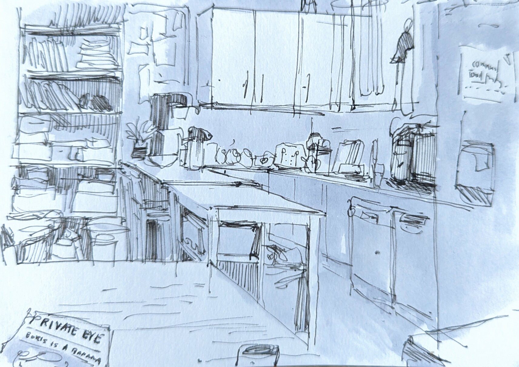 The Skiff kitchen/mess. This is my coworking space where I eavesdrop on all sort of interesting conversations that have nothing to do with me, I get to stick my oar in various places it's not invited and there's effectively infinite free coffee. Basically what I miss about office working.