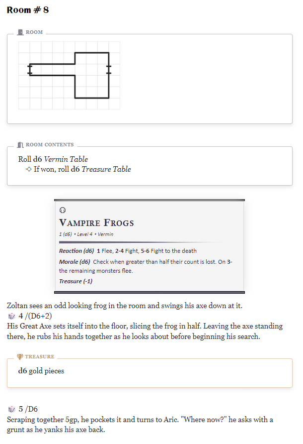 Screenshot of one room from my first dungeon using #Obsidian and the InlineScripts plugin to automate playing #FourAgainstDarkness. The plain black text is my writeup, everything else is generated by scripts I've written.