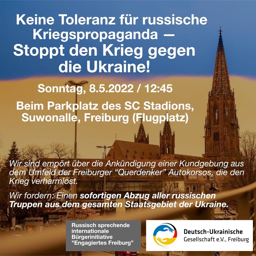 Am So 8.5. soll es in #Freiburg einen #Autokorso aus dem #Coronaleugner-Umfeld geben, dass den russischen Krieg gegen die Ukraine verharmlost, bzw. sogar “für die Unterstützung Russlands”.