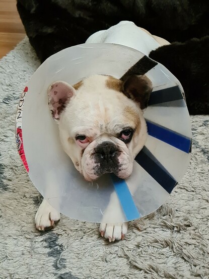 @blakeheathsnow Odin the French bulldog, normally a very happy lad...but not a happy boy right now. No walks & bucket on head for 4 weeks...but heading into the home strait.