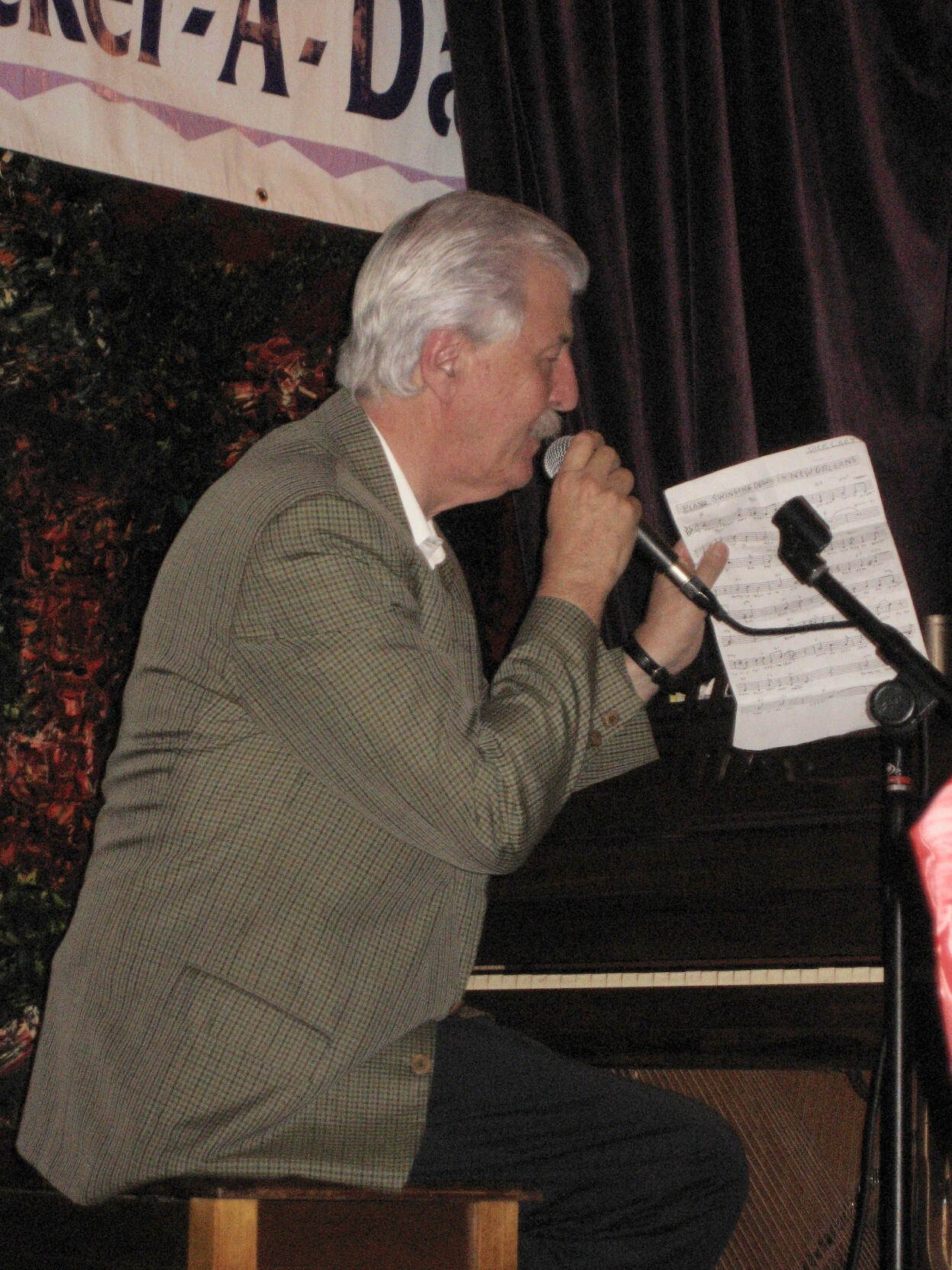 Part of the "Nickle a Dance" jazz event. Thompson is holding sheet music for "Swinging Down in New Orleans"
