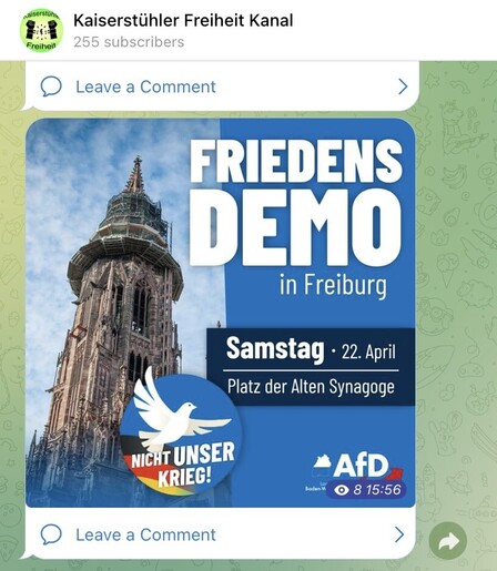 Sie einer an: Im Kanal der “Kaiserstühler Freiheit” einer - in meinen Augen weit rechten #Querdenker Gruppe, die nun auf #friedensschwurbler macht - wird die #AfD Demo am kommenden Samstag in #Freiburg beworben.