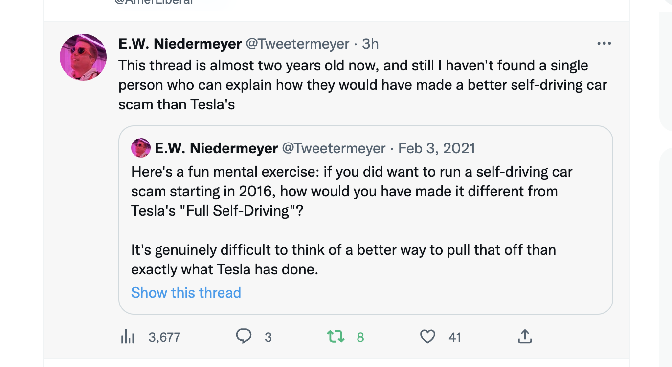 Wie verzweifelt muss die Politik der #USWirtschaftsförderung sein, dass man Unternehmen walten lässt, deren Produkt nicht näherungsweise dem Titel #FullSelfDriving entspricht und reihenweise Menschen gefährdet?