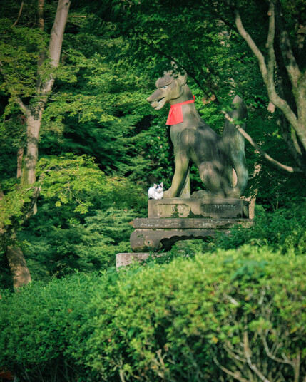 This was taken at the Fushimi Inari shrine, in Kyoto. Primarily known for its 1000 torii gates there are also many, many statues, mostly of Inari the fox, which made this lion(?) stand out to me.
