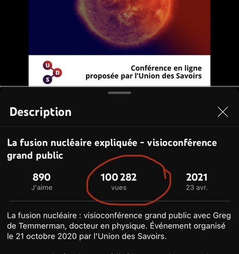 @Gregdt1, ça y est, la barre des 100k vues a été dépassée pour notre visioconférence avec toi sur la #FusionNucléaire 😎😎😎 https://twitter.com/Gregdt1/status/1588485006028345346