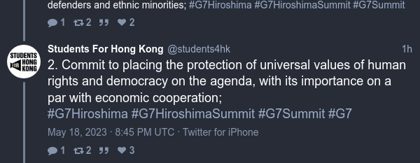 R to @students4hk: 2. Commit to placing the protection of universal values of human rights and democracy on the agenda, with its importance on a par with economic cooperation; #G7Hiroshima #G7HiroshimaSummit #G7Summit #G7 https://nitter.hongkongers.net/students4hk/status/1659299116831367169#m